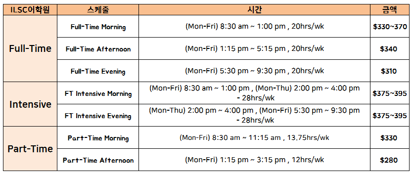 그럼 ILSC 의 코스 스케줄에 대해서 살펴볼까요.
